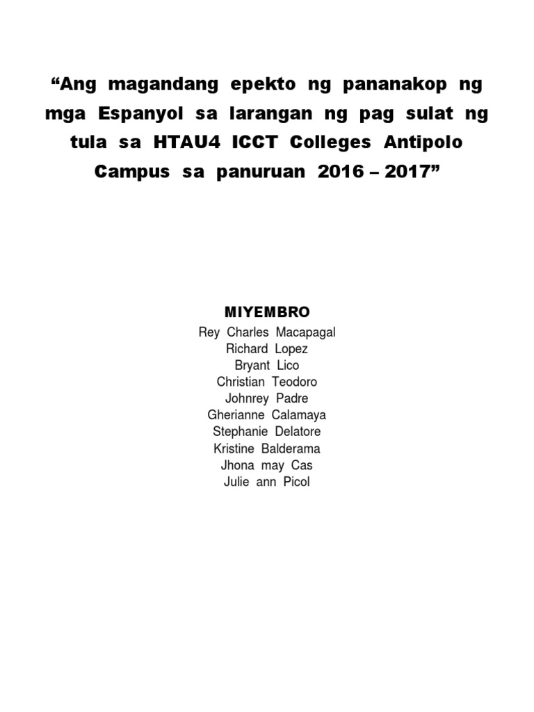 Ang Magandang Epekto Ng Pananakop Ng Mga Espanyol Sa Larangan Ng Pag Sulat Ng Tula Sa Htau4 Icct Colleges Antipolo Campus Sa Panuruan 2016 Docx