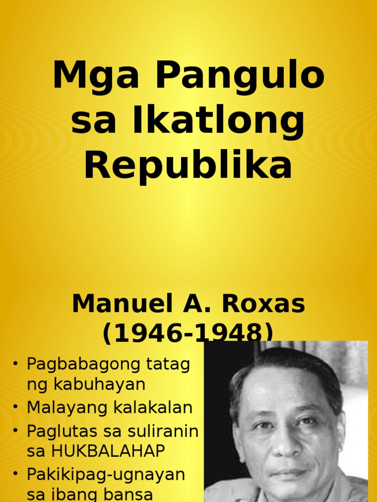 Ang Ikatlong Republika ng Pilipinas ay tumutukoy sa kasaysayan o gobyerno ng Pilipinas mula Hulyo 4 1946 hanggang Setyembre 21 1972 na nagsimula sa isang masayang seremonya sa Luneta at natapos sa isang malungkot na pangyayari na ang patagong pagdedeklara ng Martial Law. Sino-sino ang mga pangulo ng pilipinas. Siya ay ang ikalimang Pangulo ng Republika ng Pilipinas 28 Mayo 1946 15 Abril 1948.