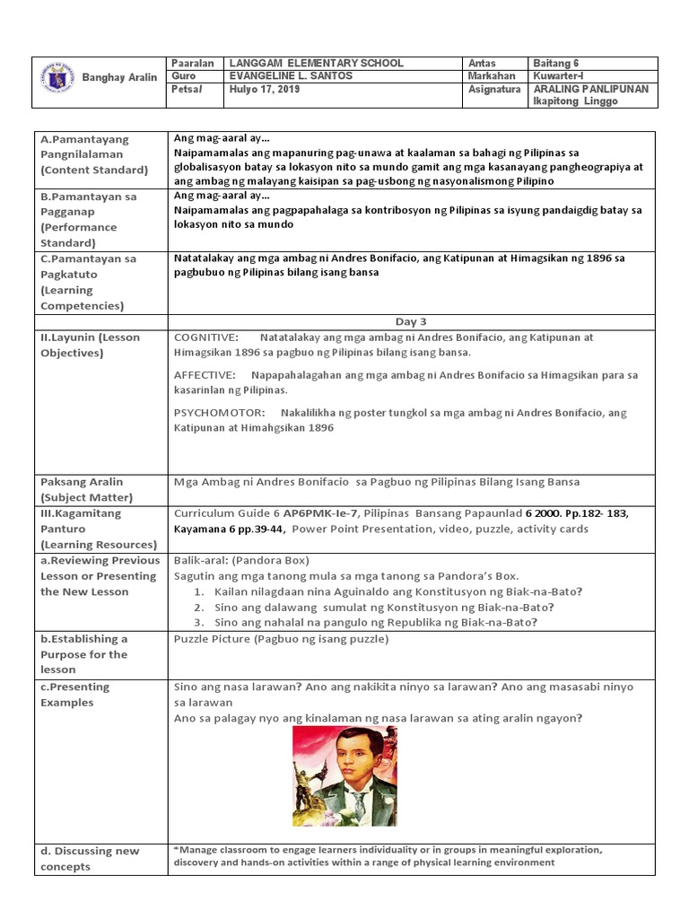 Ap6 Q1 W5 D1x Mga Ambag Ni Andres Bonifacio Sa Pagbuo Ng Pilipinas Bilang Isang Bansa Balik Aral Itambal Ang Hanay A Sa Hanay B Hanay A Hanay B 1 Course Hero