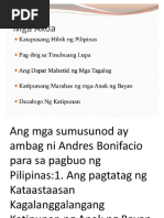 Rebolusyon dakilang pamana ni Gat Andres Bonifacio sa masang anakpawis. Pamantayan sa Pagganap Performance Standard Naipapamalas ang pagpapahalaga sa kontribusyon ng Pilipinas sa isyung pandaigdig batay sa lokasyon nito sa mundo. Isinulat niya ang Pag-ibig sa Tinubuang Lupa Sampung Utos Dekalogo ng Katipunan at iba pang akdang nakaimpluwemsiya sa maraming Pilipino Kasanayan.