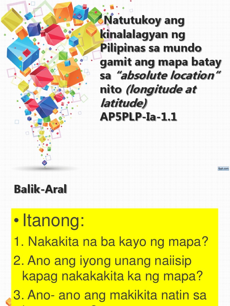 Natatalakay ang konsepto ng bansa Nakapagbubuo ng kahulugan ng bansa Naipapaliwanag na ang pilipinas ay isang bansa Natutukoy ang relatibong lokasyon relative location ng pilipinas batay sa mga nakapaligid dito gamit ang pangunahin at pangalawang direksyon Natutukoy sa mapa ang kinalalagyan ng bansa sa rehiyong asya at mundo Nakapagsasagawa. Kaso lang bilang isang Pilipino ipagmamalaki ko pa rin siya.